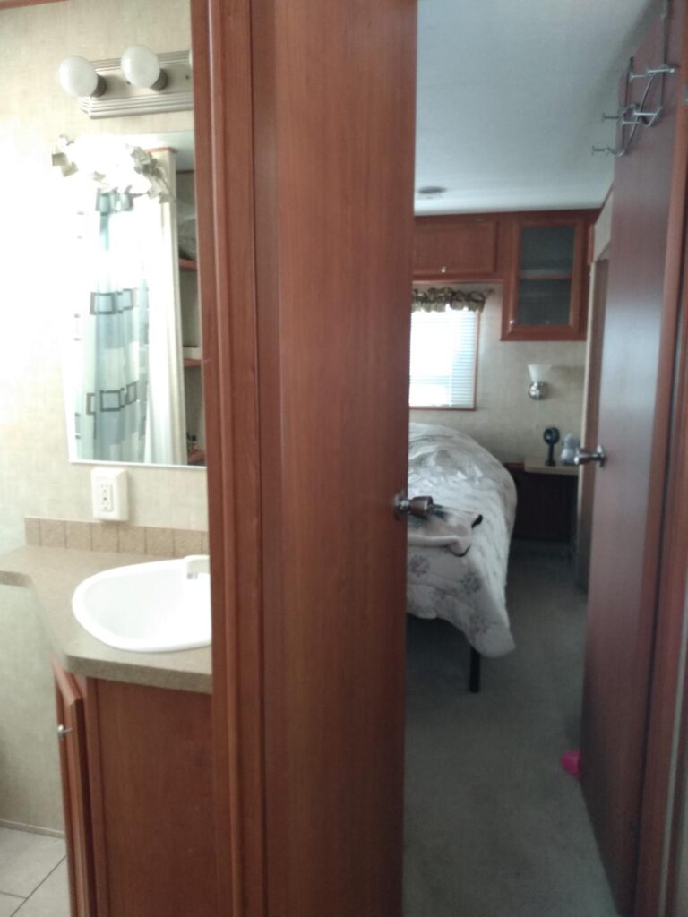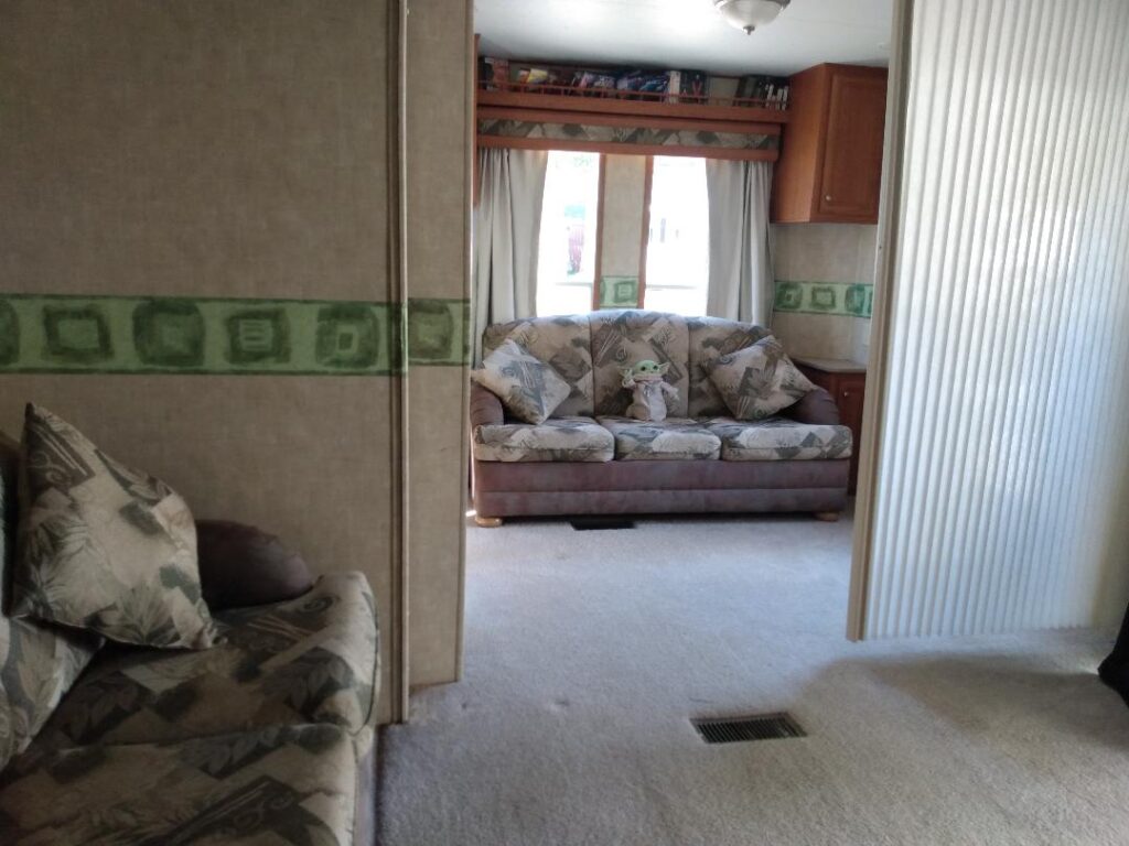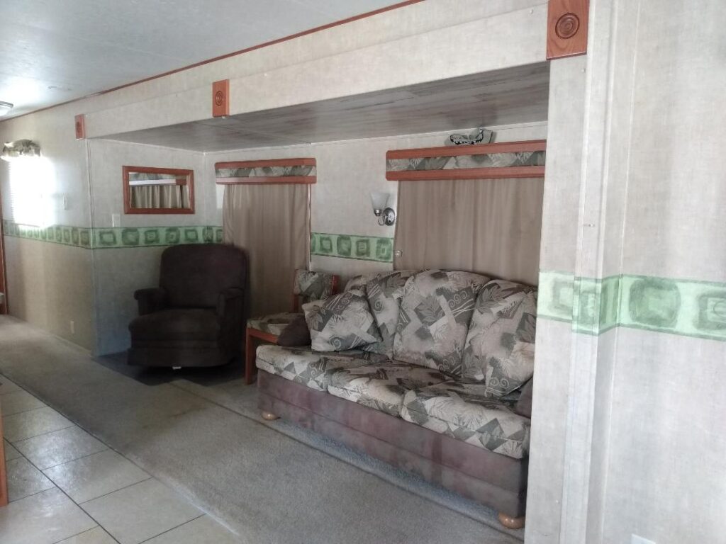 Just a short drive from the front entrance to the park. Stamped concrete parking area, 300 sq ft deck. Trailer sleeps 6. Very close to a bathhouse and just a short walk to the playground at circle 17. Furniture & contents included.